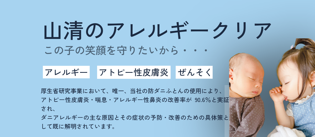 厚生省研究事業において、唯一、当社の防ダニふとんの使用により、 アトピー性皮膚炎・喘息・アレルギー性鼻炎の改善率が90.6%と実証され、 ダニアレルギーの主な原因とその症状の予防・改善のための具体策として既に解明されています。