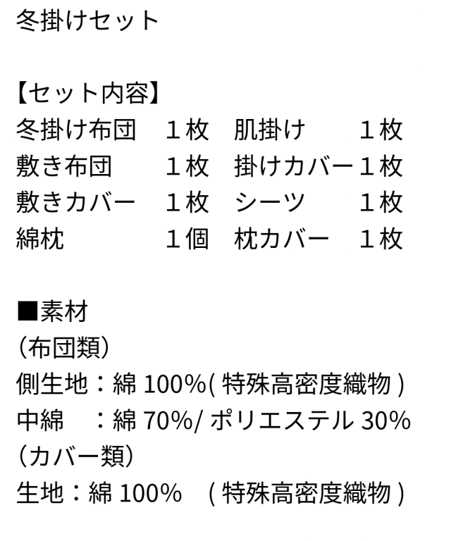 掛けカバー 1枚、敷きカバー1枚、シーツ 1枚、綿枕 1個、枕カバー1枚