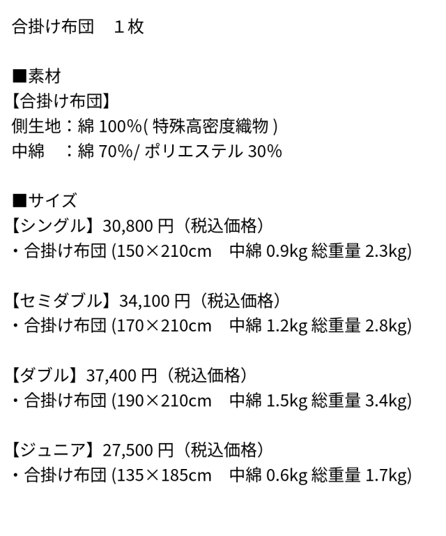 ・合掛け布団(150×210cm 中綿0.9kg 総重量2.3kg)